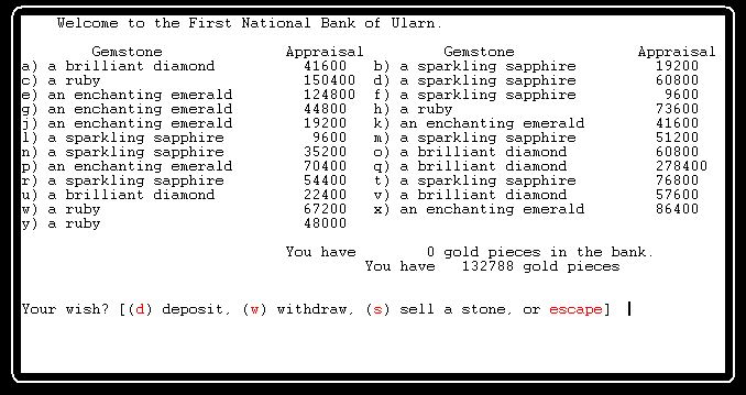 Playing ULarn requires a different gameplan than regular Larn. The book and chest that you buy from the store are actually worth less than they cost, unlike the original Larn where you can buy the book for 2000 and sell it for 9115, or buy the chest for 5900 and sell it for 10406 and instantly have some good seed money for your adventuring. On the flip side, however, the books and chests in Ularn are MUCH more valuable. In my old Volcano Lottery strategy I would save enough money to safely traipse around the Volcano looking for Books and Chests until I had enough to buy the Lance of Death before descending past level 3 in the Dungeon. You don't have to do that in Ularn because just one book is worth over 100,000 gold and one chest from V1 is 300,000 gold.